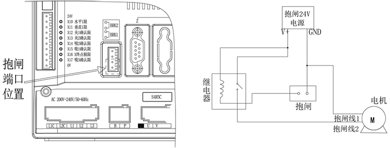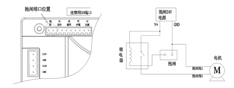 注:抱閘端口必須通過外接繼電器去控制抱閘器工作。