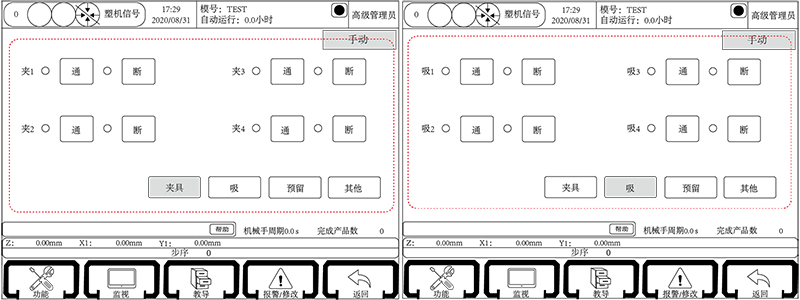 機(jī)械手系統(tǒng)型號(hào)為QC-S3G,權(quán)限切換到高級(jí)管理員身份,首先撥到手動(dòng)狀態(tài)下,治具頁(yè)面設(shè)置,點(diǎn)擊觸摸屏右下角的按鈕“夾具”和“吸”按鈕分別進(jìn)入治具的手動(dòng)操作頁(yè)面,如下圖: