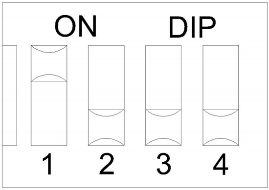 例如:二進(jìn)制0001中最低位即個位數(shù)為1對應(yīng)撥碼開關(guān)中“1”的開關(guān),十位數(shù)0對應(yīng)撥碼開關(guān)中“2”的開關(guān),千位數(shù)0對應(yīng)撥碼開關(guān)中“3”的開關(guān),萬位數(shù)0對應(yīng)撥碼開關(guān)中“4”的開關(guān),則撥碼開關(guān)中“1”對應(yīng)的開關(guān)應(yīng)撥到“ON DIP”一頭,撥碼開關(guān)中的“2”“3”“4”對應(yīng)的開關(guān)都撥到“1234”一頭,二進(jìn)制0001的撥法如下圖: