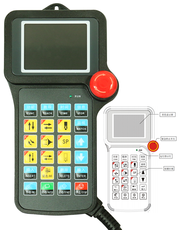斜臂機械手應用系統為華成系列HC-X1斜臂機械手控制系統,手控器的操作面板按鍵介紹如下: