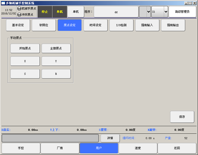 手動(dòng)狀態(tài)下按下急停按鈕斷掉伺服使能,手動(dòng)移動(dòng)各軸至原點(diǎn)位置然后再進(jìn)入原點(diǎn)設(shè)定頁面下先點(diǎn)擊【開始原點(diǎn)】按鈕再點(diǎn)【設(shè)為原點(diǎn)】按鈕,待各軸坐標(biāo)都顯示為0后原點(diǎn)設(shè)置成功。