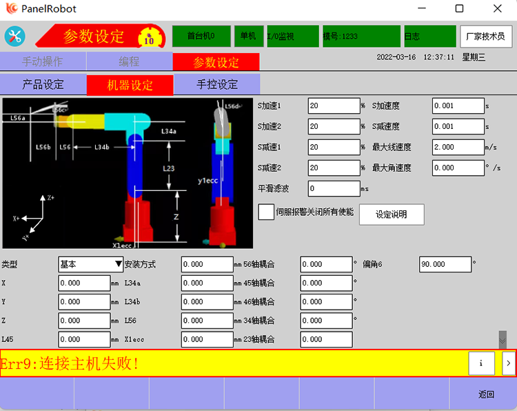 六關(guān)節(jié)機(jī)器人系統(tǒng)應(yīng)用采用華成系列六軸機(jī)器人控制系統(tǒng),首次通電后需要注意的參數(shù)設(shè)置問題,分為伺服電機(jī)的參數(shù)和結(jié)構(gòu)的參數(shù)設(shè)置。