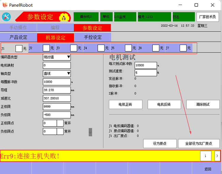 首先,工業(yè)機器人需要校準機械零位,先手動將機器人走到零位,對準刻度后,點擊電機參數(shù)界面的全部設為原點。