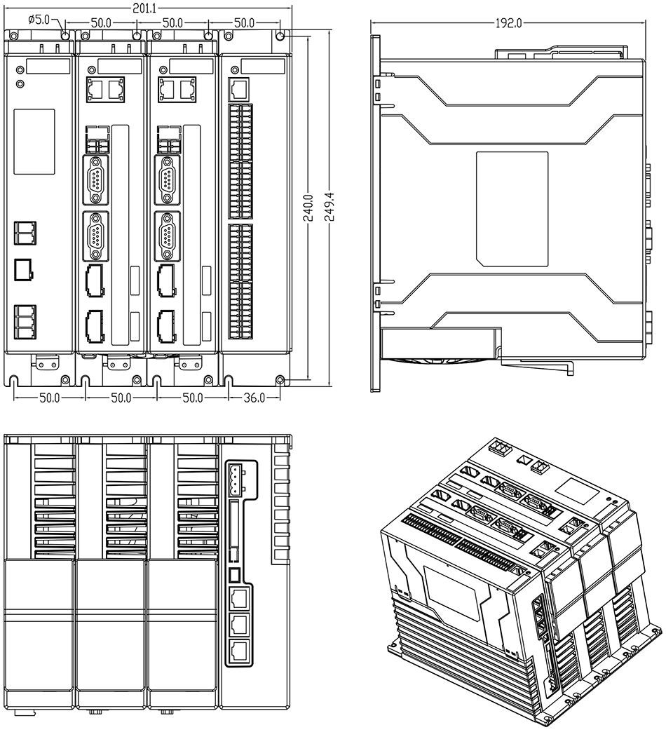 3)省略號處單元模塊相同,系統軸數可選擇2軸、3軸、4軸、5軸、6軸、7軸、8軸。端口連接方式相同。